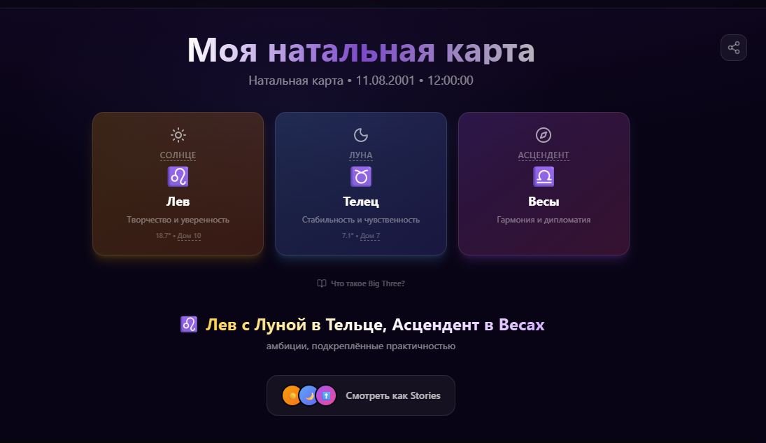 Для расчёта Big Three нужны три параметра: дата, время и место рождения. Вы можете построить натальная карта с расшифровкой — бесплатно, за несколько минут — и сразу увидеть свои Солнце, Луну и Асцендент с AI-интерпретацией каждого элемента.